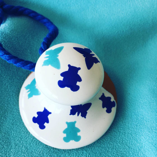 Exfoliafdor de barro cocido esmaltado y decorado con diferentes motivos, ya sean mariposas, ositos, corazones.. Son piezas únicas realizadas a mano y que siempre varían. Los colores también pueden ser de la misma gama o mezclar azules y verdes.